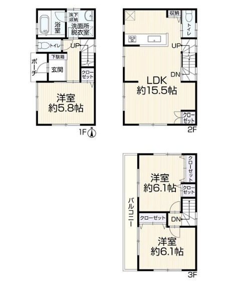 LDK 15.5帖 / 洋室 6.1帖 / 洋室 6.1帖 / 洋室 5.8帖 / |