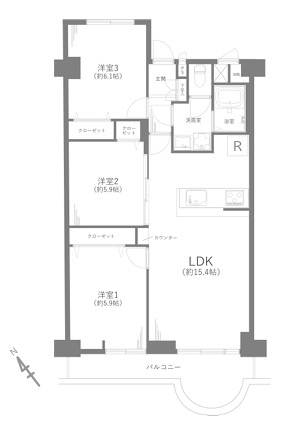 LDK 15.4帖 / 洋室 5.9帖 2室 / 洋室 6.1帖 / |